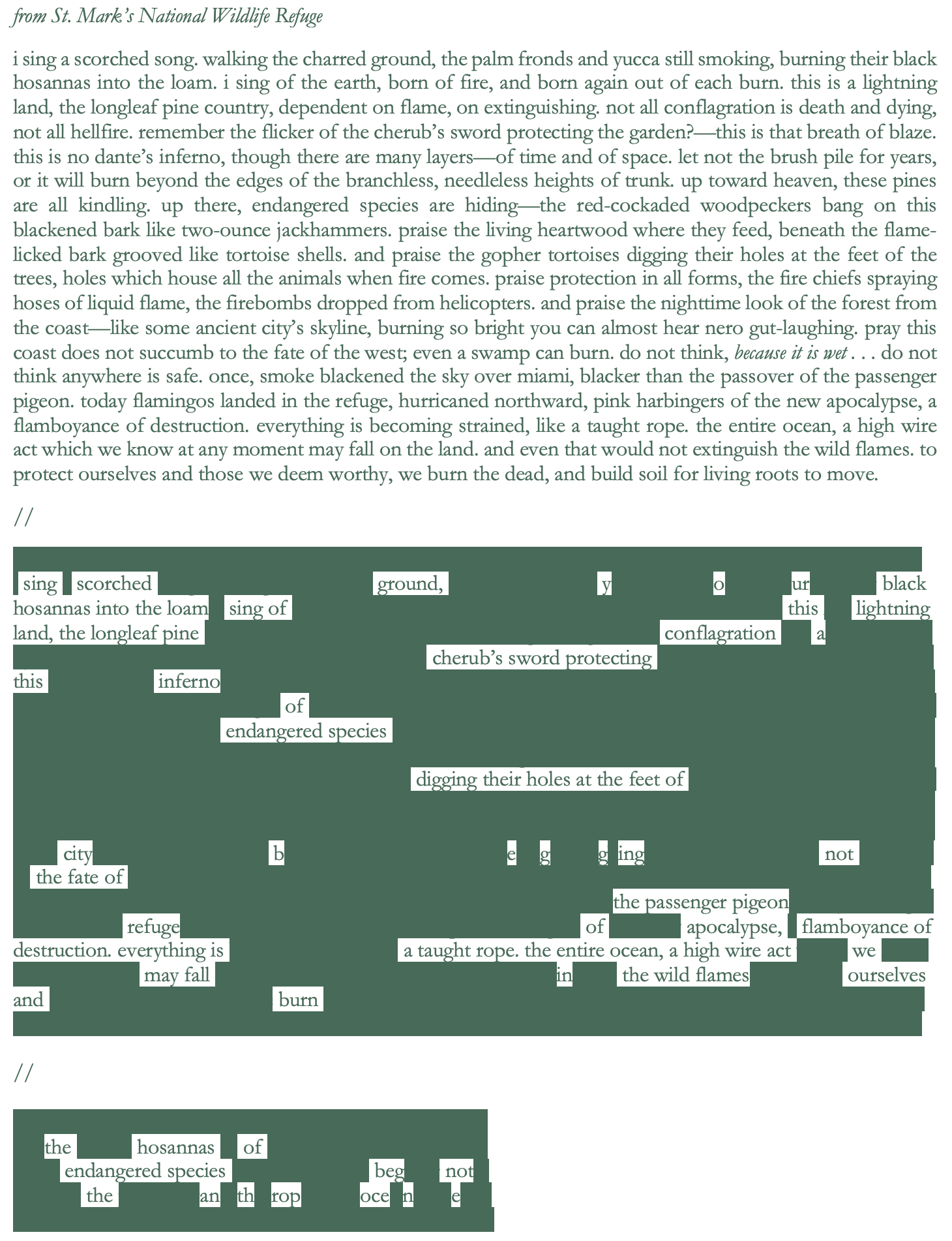 i sing a scorched song. walking the charred ground, the palm fronds and yucca still smoking, burning their black hosannas into the loam. i sing of the earth, born of fire, and born again out of each burn. this is a lightning land, the longleaf pine country, dependent on flame, on extinguishing. not all conflagration is death and dying, not all hellfire. remember the flicker of the cherub’s sword protecting the garden?—this is that breath of blaze. this is no dante’s inferno, though there are many layers—of time and of space. let not the brush pile for years, or it will burn beyond the edges of the branchless, needleless heights of trunk. up toward heaven, these pines are all kindling. up there, endangered species are hiding—the red-cockaded woodpeckers bang on this blackened bark like two-ounce jackhammers. praise the living heartwood where they feed, beneath the flame-licked bark grooved like tortoise shells. and praise the gopher tortoises digging their holes at the feet of the trees, holes which house all the animals when fire comes. praise protection in all forms, the fire chiefs spraying hoses of liquid flame, the firebombs dropped from helicopters. and praise the nighttime look of the forest from the coast—like some ancient city’s skyline, burning so bright you can almost hear nero gut-laughing. pray this coast does not succumb to the fate of the west; even a swamp can burn. do not think, because it is wet . . . do not think anywhere is safe. once, smoke blackened the sky over miami, blacker than the passover of the passenger pigeon. today flamingos landed in the refuge, hurricaned northward, pink harbingers of the new apocalypse, a flamboyance of destruction. everything is becoming strained, like a taught rope. the entire ocean, a high wire act which we know at any moment may fall on the land. and even that would not extinguish the wild flames. to protect ourselves and those we deem worthy, we burn the dead, and build soil for living roots to move.